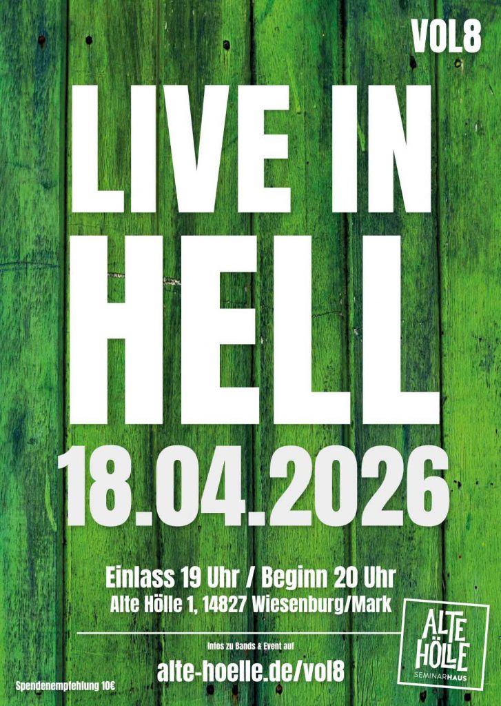 Wir kündigen LIVE IN HELL VOL. 8 an und laden euch ein, mit uns den Frühling standesgemäß zu feiern. Zum achten Mal holen wir Bands aus dem Underground in unsere Scheune, um sie mit handgemachter Musik, Haltung und Energie zu füllen.